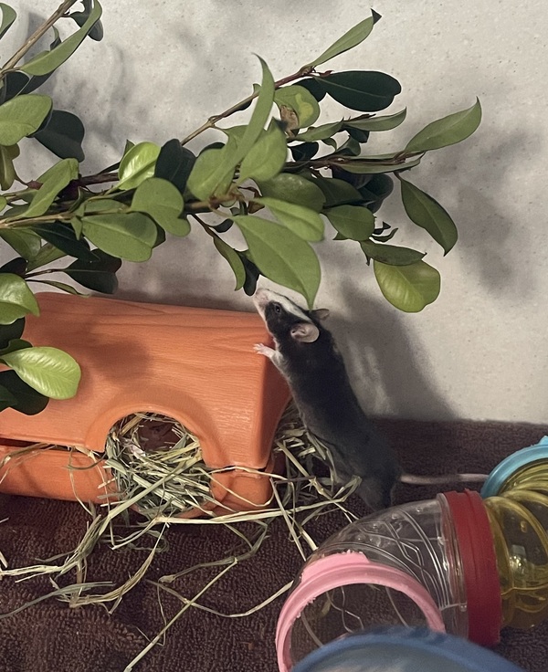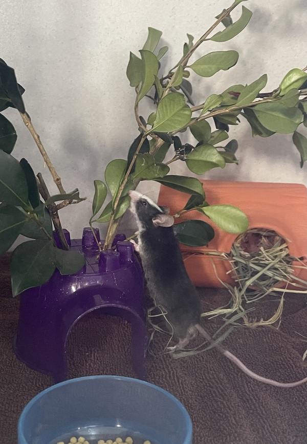 You can get creative with your toilet paper rolls, tissue and cereal boxes to make fun new hidey holes and tunnels for your mice to explore. Twigs and branches also make great enrichment toys. Mice require a constant supply of high-quality rodent mix as well as fresh fruit and veggies.