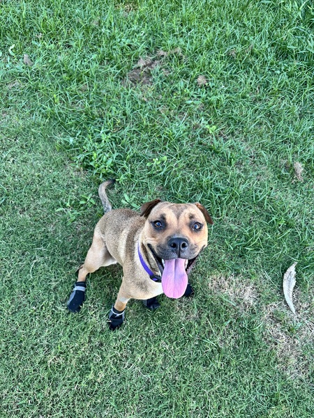 She has also been in a foster home with a cat, and has shown to be social with them even if they don't quite understand her play bows. She is open to a home with a feline friend as long as adopters are willing to allow a slow introduction.