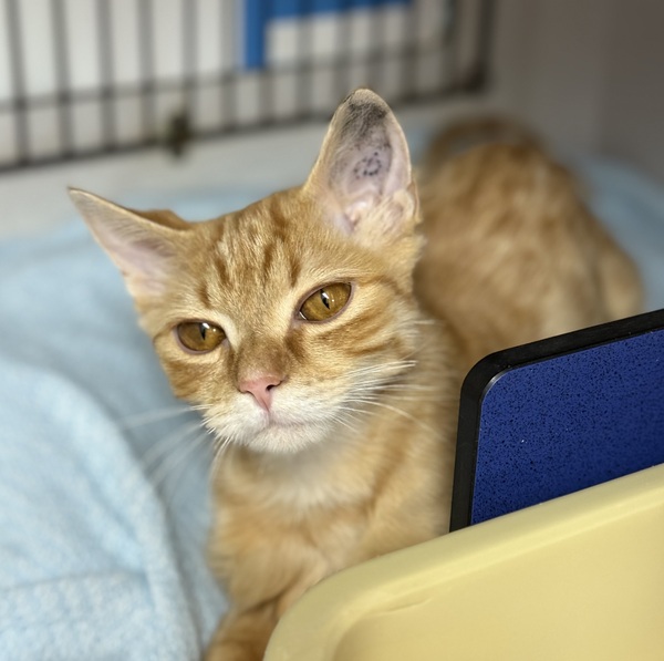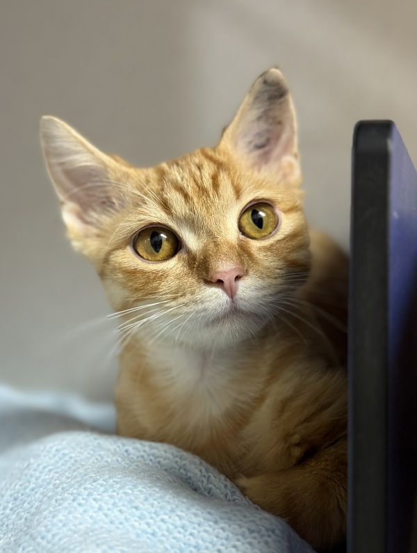 Meet Merrit -a shy sweetheart with a heart full of potential. When Merrit first arrived in foster care, he was overwhelmed and unsure, spending his time tucked away in cozy hiding spots and needing lots of encouragement to eat. But just a few days later, his gentle personality began to shine. Merrit started seeking out pats, eating from his foster's hand, and even following them around the house like a little shadow. He's a floor-level cuddler-happy to snuggle when you're down at his level, though he's not a fan of being picked up. Merrit gets along beautifully with other animals, having bonded with his foster's young cat and even greeting visiting dogs with curiosity and calm. He's chatty, playful, and affectionate once he feels safe. Merrit would thrive in a quiet home with patient people who understand that the best relationships take time. If you're looking for a loyal companion who just needs a little time to bloom, Merrit is your guy.