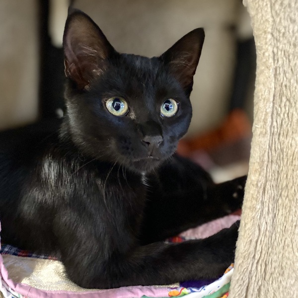 My name is Seraphina and I'm a sweet, charming girl who is becoming braver each day and I'm already purring and giving little kisses. When you come to see me, I'll come running out to meet you. My fur coat is very sleek and black. Suggestions for my care are:-
