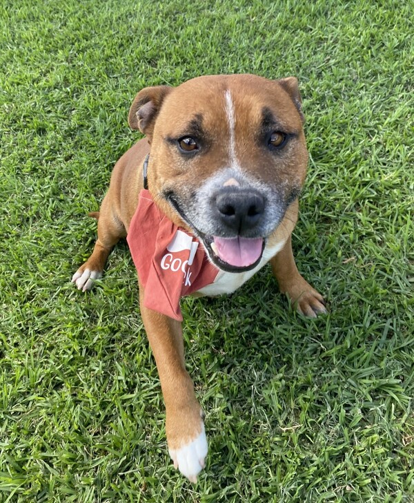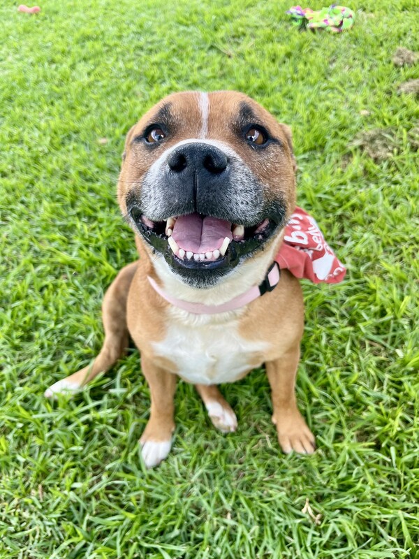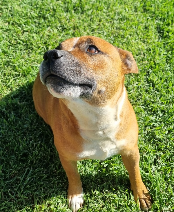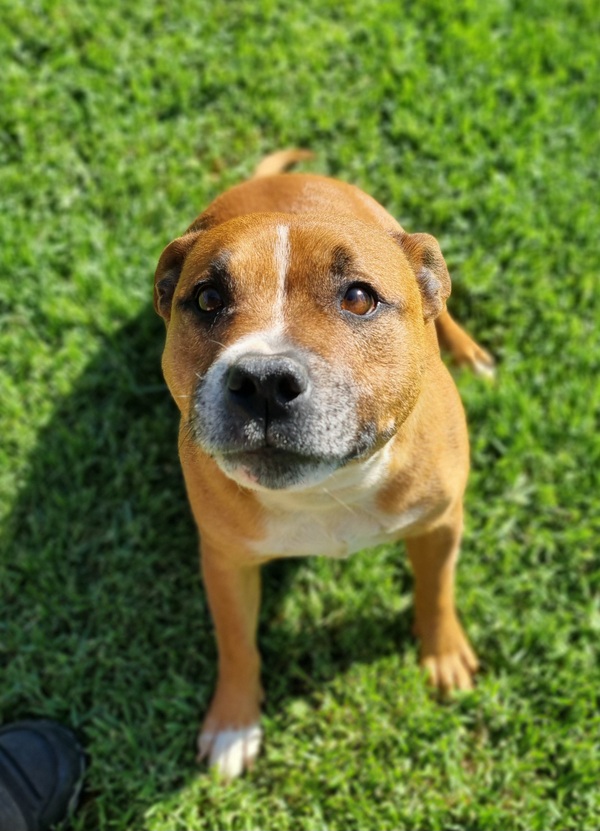 Rosie enjoys being indoors with her people and will happily travel along for car rides. Outside time may need supervision, as she can be curious about wildlife. She can get excited at times and may jump up, so a home with older, steady children would be ideal - though families familiar with Staffy personalities may be a good match too.