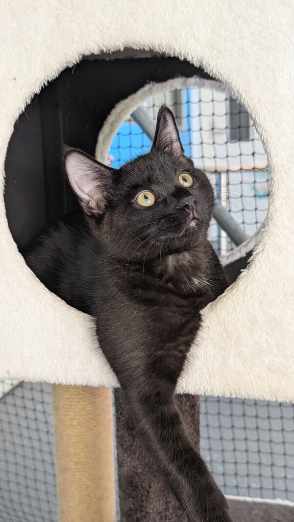 Hey there! My name is Peep. I can be a vocal kitty at times especially when I am hungry. I can be a little reserved at first and it takes me some time to warm up to you but once I feel comfy I am an affectionate and playful kitty cat. I love my brother and I tolerate the other kitten housemates though I do show my distaste for their nonsense a lot. If you already have a laid back cat I should get on with them fine, just give me time. I think a house with cat savvy kids (or no kids) will be great for me. Once I adjust to my home I will be a silly and rambunctious kitten just you wait!