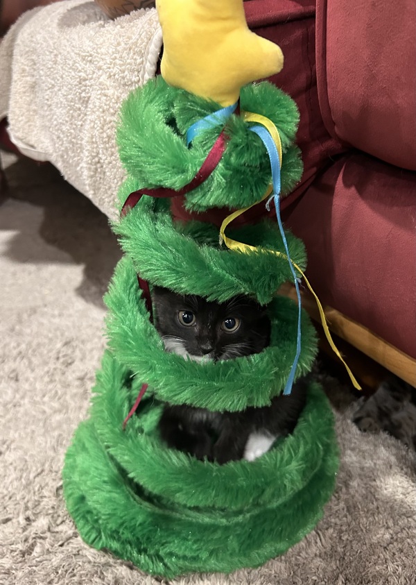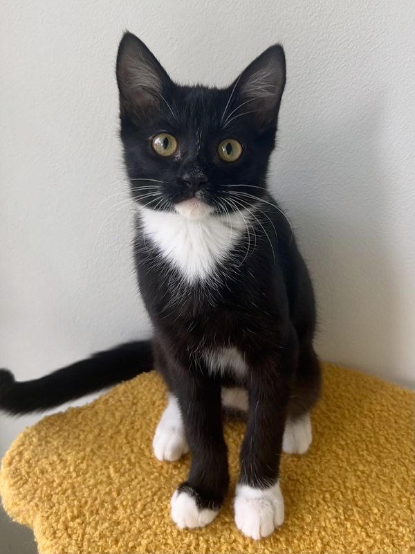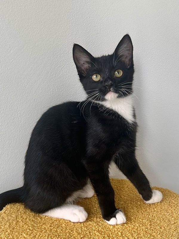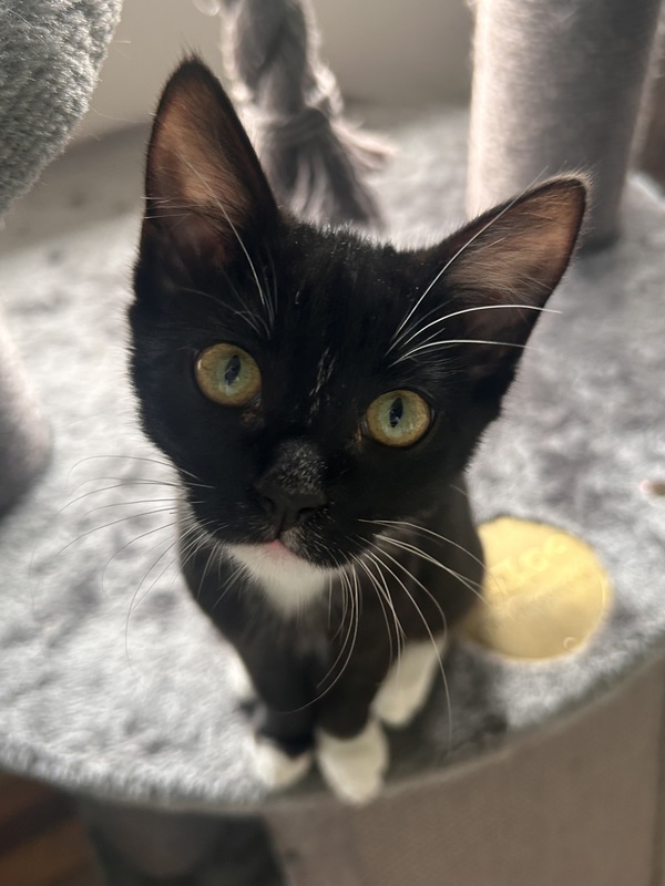 Hi, I'm Delta! I'm the most gorgeous girl, with the cutest little pink lip and the sleekest fur! I'm packed full of energy, I can play and zoom all day! Especially with other kittens, we have so much fun together, I'm a bit of a goofball when I play so I'll keep you entertained! I'm super friendly too, and I'll greet you with little chirps and kisses, and maybe a lil nibble too! Im a very affectionate girl, I love to cuddle up with you and get endless pats! I was a little scared of the big dogs when I first went into foster but I warmed up them quickly and even come up to them for a cuddle, so I wouldn't mind living with a gentle dog! So if you're looking for a playful but sweet girl then come meet me today!!
