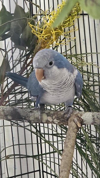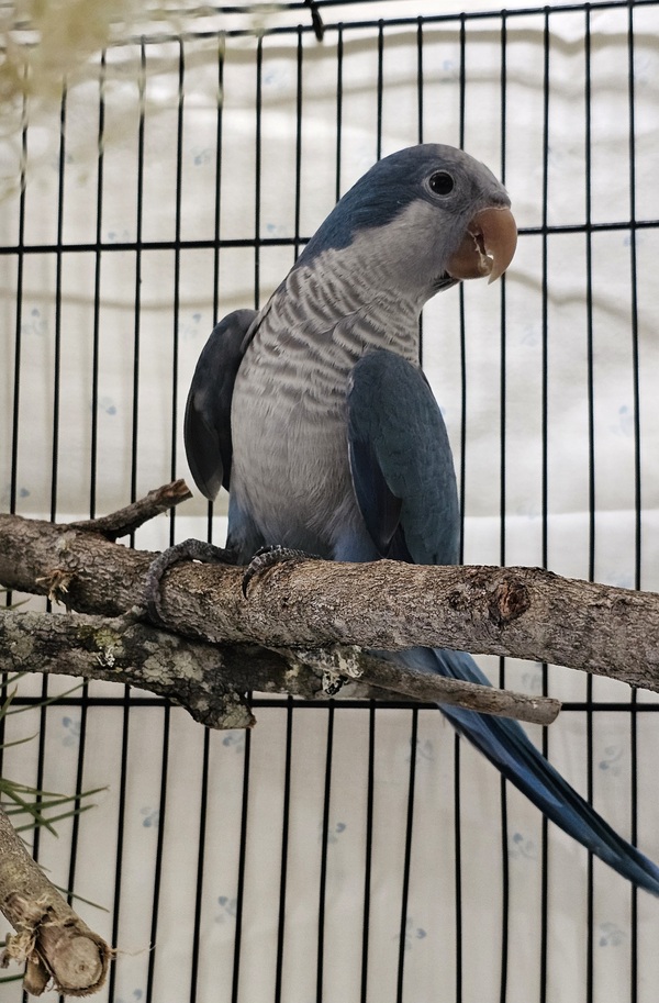 Squawk Norris is a gentle blue Quaker with a sensitive soul. They're feeling a little unsure about the world right now and take comfort in calm surroundings and predictable routines. Squawk Norris prefers to watch quietly from a safe distance while building confidence at their own pace.