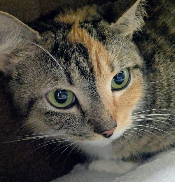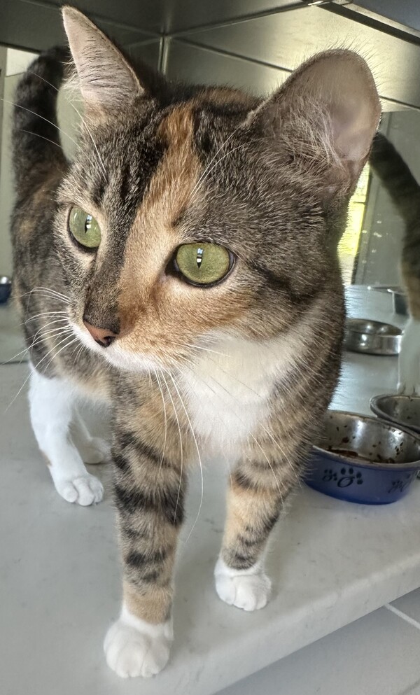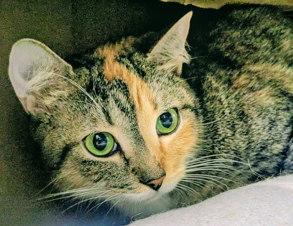 Kiwi is a very shy and reserved little cat. Nevertheless, she has slowly started to make some progress and will enjoy some gentle affection. Kiwi will need to be started in a small launch room and allowed time to settle before allowing to explore the rest of the house, can become easily overwhelmed in large open spaces. Scratch posts/Cat trees, hides (like cardboard boxes and cat igloos), access to shelves/dressers are all wonderful to provide ample safe spaces, both high and low, all around the house. We recommend a patient and understanding adopter who can recognize that Kiwi will be timid going into a new environment and may take a little while to settle in before she shows her true self! Teens or older children are recommended as they are more likely to understand cat body language.