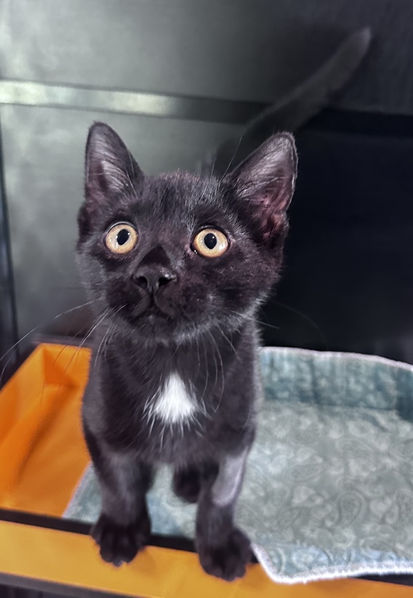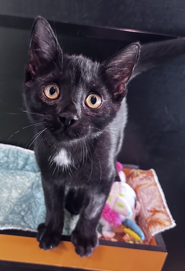 Alex is a bright, playful little three‑month‑old black kitten with the sweetest gentle nature. He's full of kitten curiosity and loves to explore every new space he discovers, bouncing from one adventure to the next with endless enthusiasm. Whether he's chasing after a dangling toy, pouncing on a rolling ball, or batting at anything that wiggles, Alex turns every moment into a game.