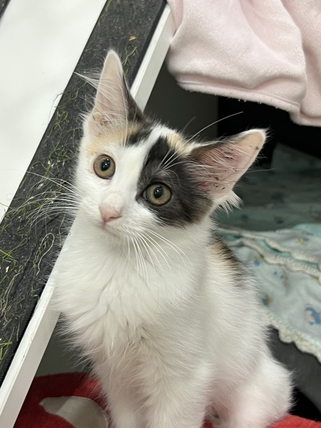 Lou Lou is a curious little girl with a lovely white and blue cream calico coat. One of her most charming features is the adorable patch over one eye, which gives her an extra dose of cuteness and character.