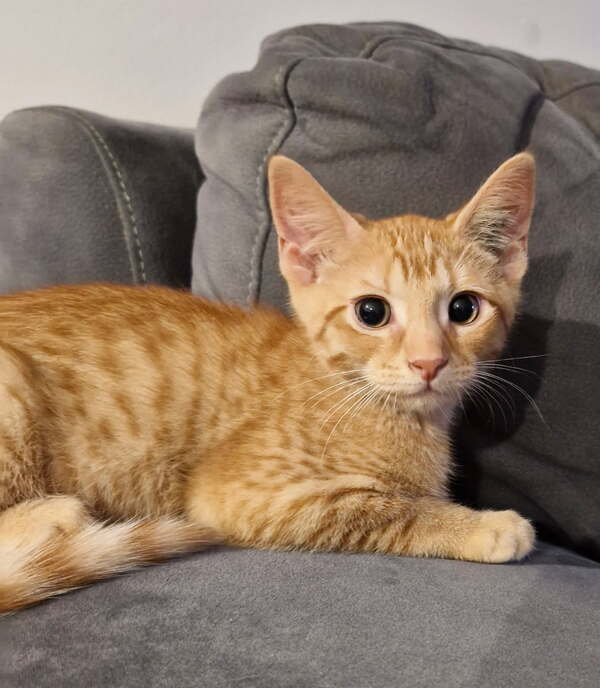 a sweet little ginger tabby boy with bright eyes, soft stripes, and a heart full of love. I'm playful, curious, and always ready for fun-whether I'm chasing toys, exploring new spots, or zooming around just to make you laugh.
