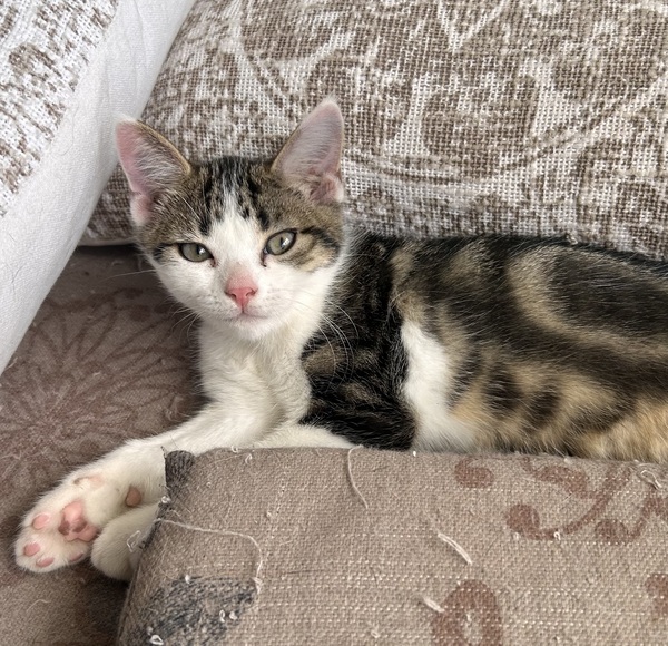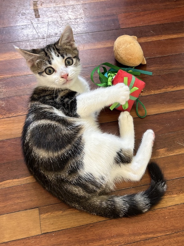 Hi, I'm Wobble! I'm a bit shy but give me a little time and I'll be zooming around, chasing toys and enjoying pats in no time! I love cuddling with my cat friends and I'm always up for lots of playing with them! I would really benefit from going to a home with another kitten or playful cat who will show me the ropes! They really help me build my confidence! I warm up to people quickly through play, I really enjoy toys! Once I'm comfortable I love pats and enjoy curling up for a nap near you! I dream of a home where I can share all my love and playful antics! I just need someone who will be patient and understanding with me while I come out of my shell! So if you're looking for a sweet gentle boy who just needs lots of loving then I'm your guy!!