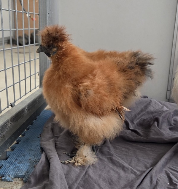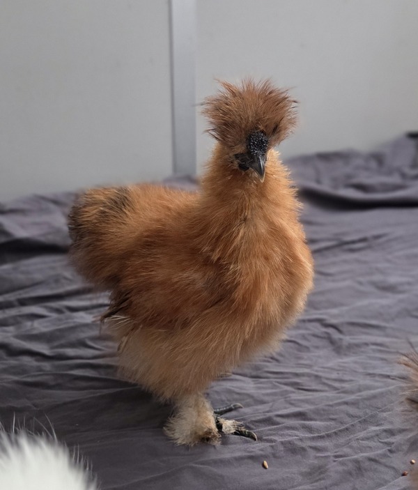 This lovely Silky, Puffin, has likely had limited handling in the past, and as a result is still shy about being touched. While they'll confidently spend time near people in their pen and are happy to approach a hand offering grain or seed, they aren't comfortable with being picked up just yet and will quickly run off when an attempt is made.